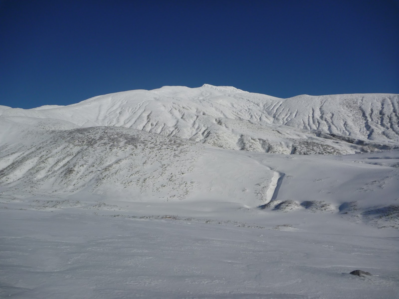 家形山方向から一切経山。こちらも埋まり具合はいまいちなので急な夏道沿いで。